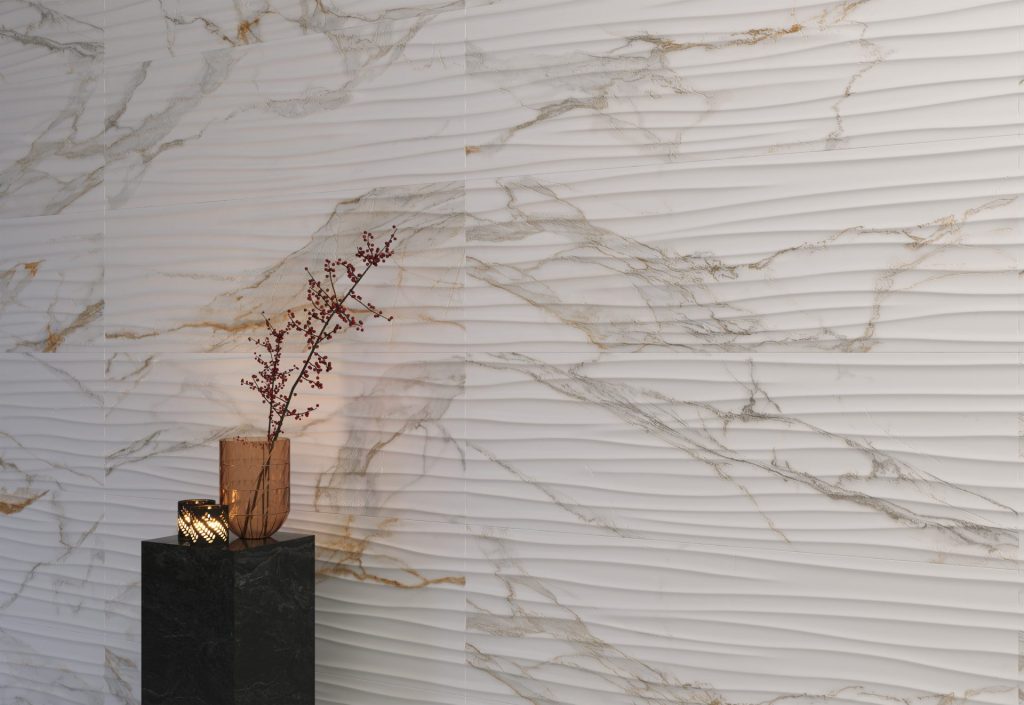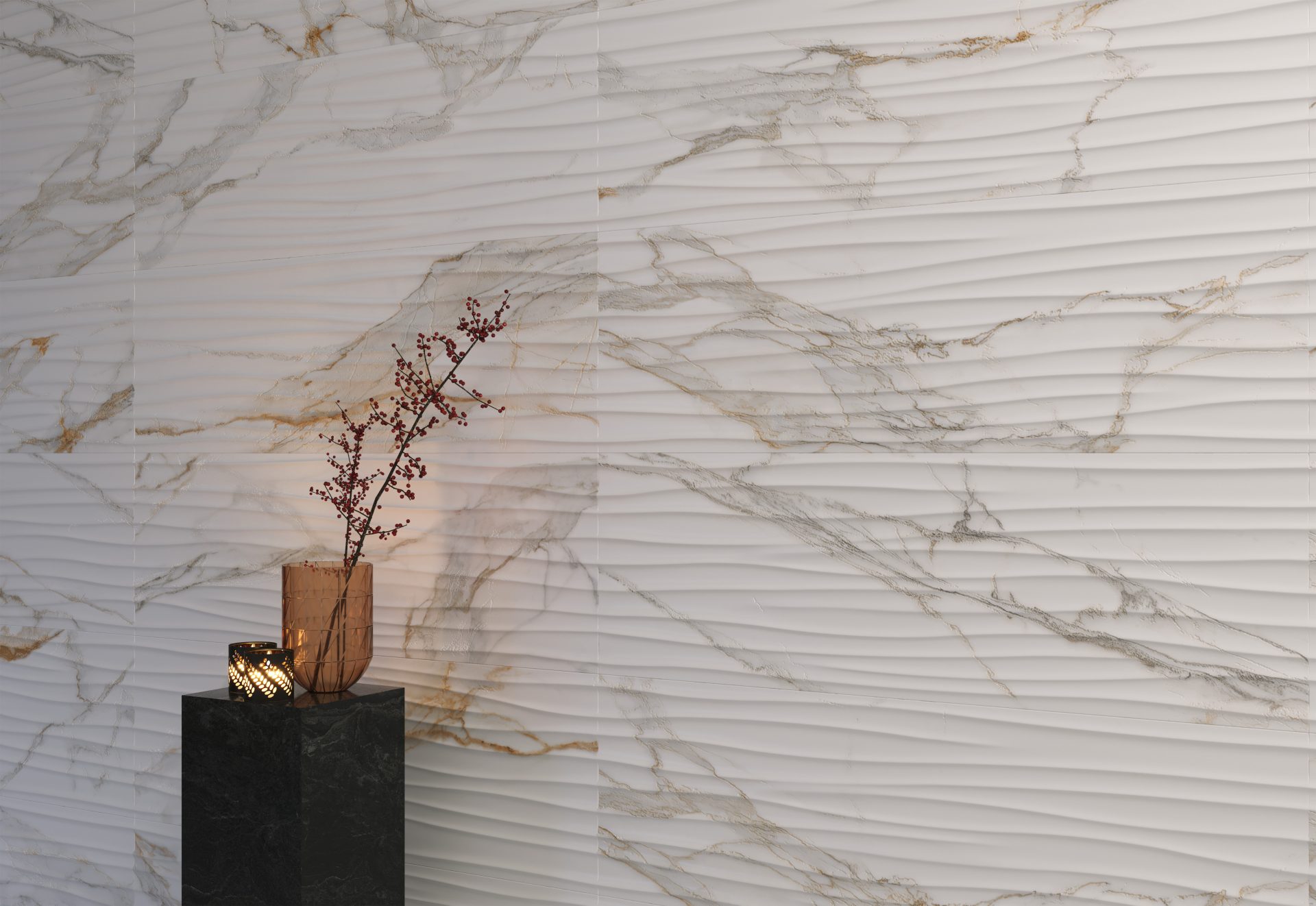 Faîence en 33.3×100 cm de la collection PRALINE. Son design de marbre blanc avec des veines grises se distingue par un veinage dans les tons caramel et or, qui lui confère identité et distinction. Dans les projets de design intérieur et d’architecture, il devient l’alternative parfaite grâce à sa chaleur et sa luminosité. Décor lisse ou avec un maximum de relief grâce à la technologie DEEP TECH (cf photo) – Autres décors et motifs assortis disponible sur demande.