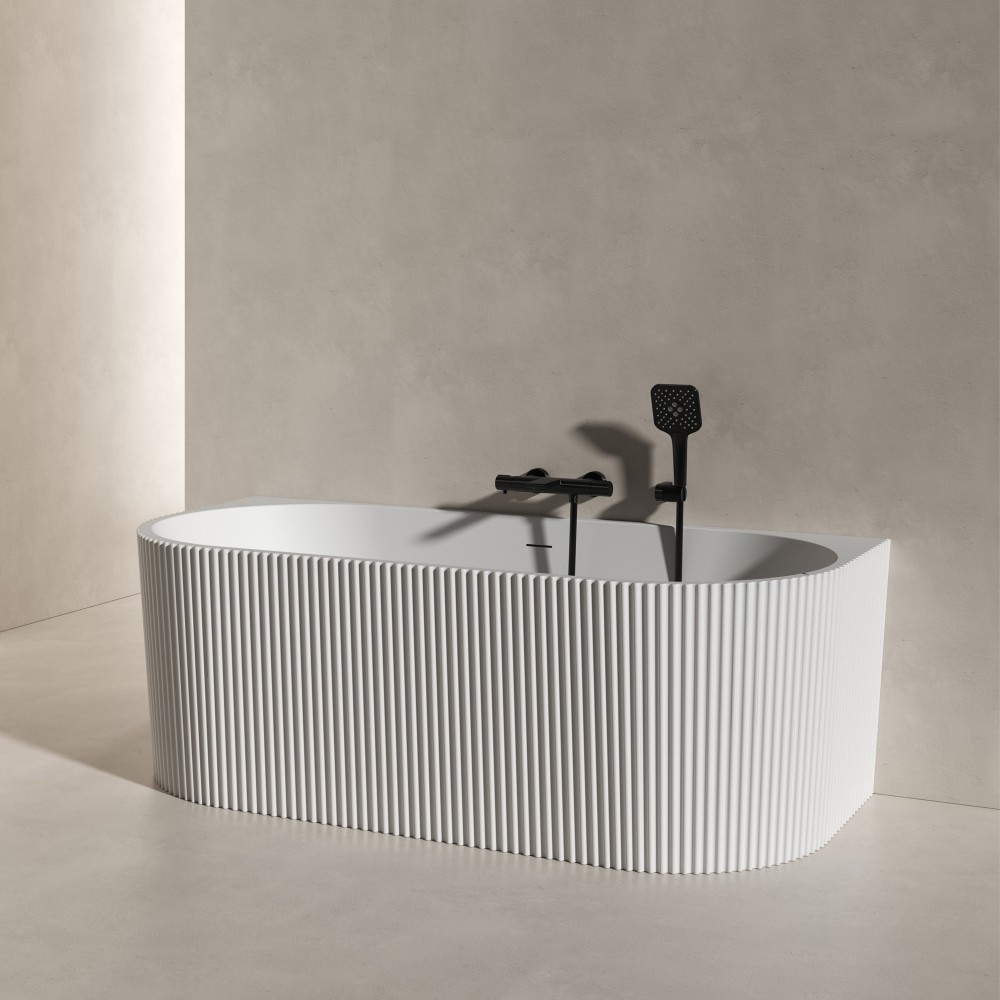 Chez gini carrelage, en îlot ou en pose murale, la baignoire HARÈS s’inspire des codes antiques et se drape de fines cannelures sur son tablier extérieur.