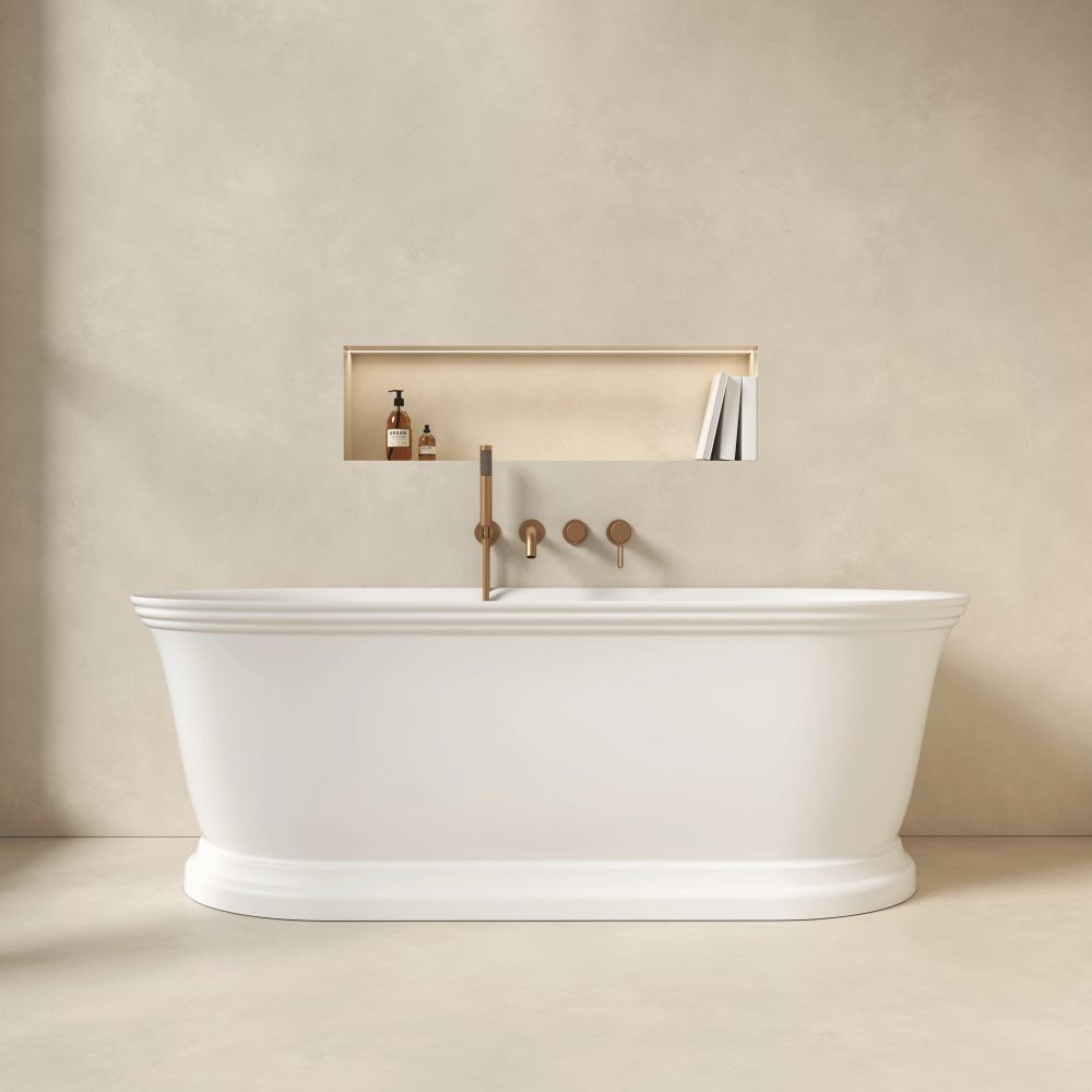 Baignoire îlot Iliade, Dimensions : L1700 x P800 x H585 mm, Volume : 277,5 litres – Poids : 45 kg, Profondeur d’eau jusqu’au rebord 440 mm, Finition : blanc mat, Matériau : acrylique thermoformé épaisseur de 3 mm.