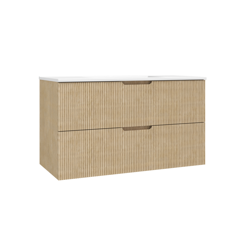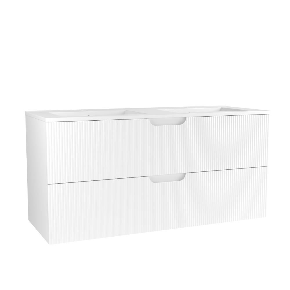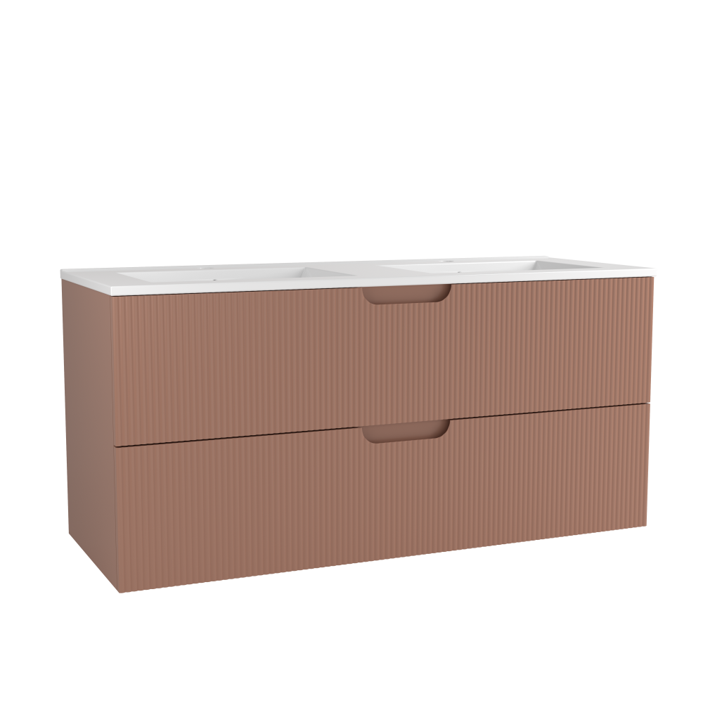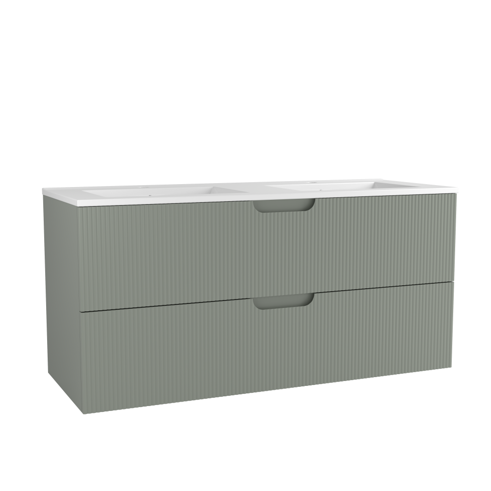 Vert sauge, terre cuite et couleur chêne s’invitent en complément du coloris blanc mat sur les façades structurées de la gamme HIPSTER, Meuble sous vasque prémonté avec 2 tiroirs en 1000 et 1200 mm – Poignées forme onglet – Tiroirs coulissants avec fermeture progressive