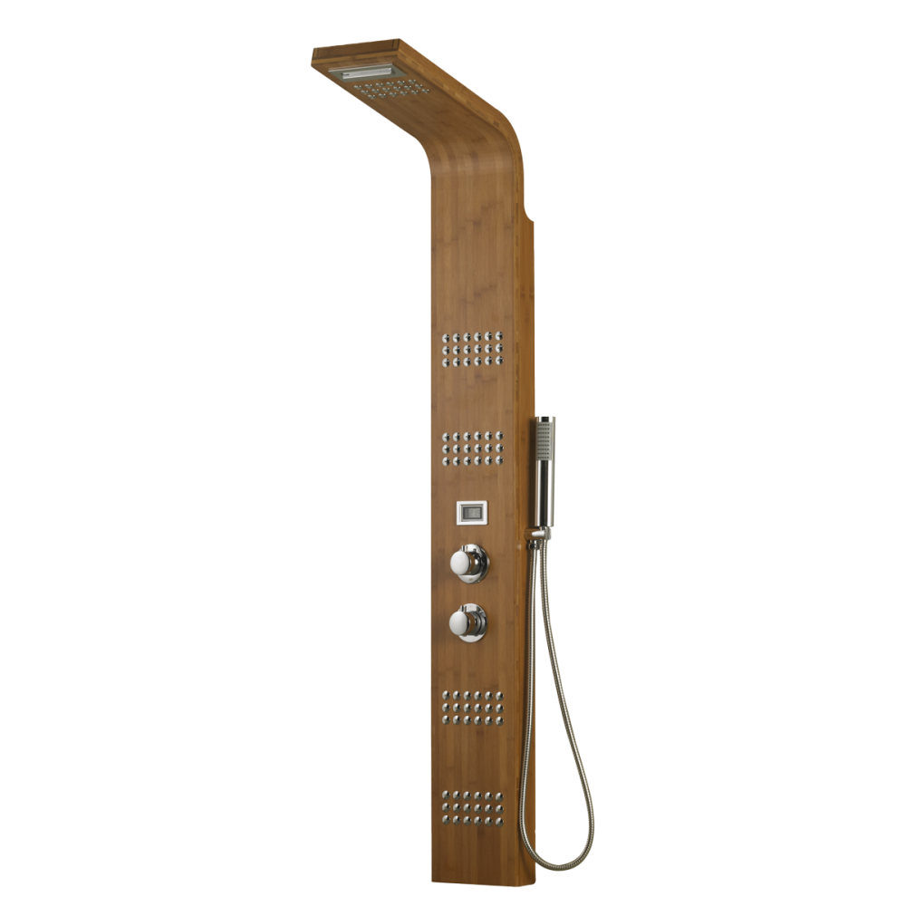Colonne de douche hydrothérapie BAMBOO. Dimensions H160 x L22 cm, Matériau : bambou, Mitigeur thermostatique, Douche de tête intégrée avec jets effet pluie et cascade, Panneaux de micro-jets hydromassage anti calcaire, Affichage digital de la température, Douchette à main en ABS, Flexible de douche 1,50 m double agrafage, Entraxe de 130 mm