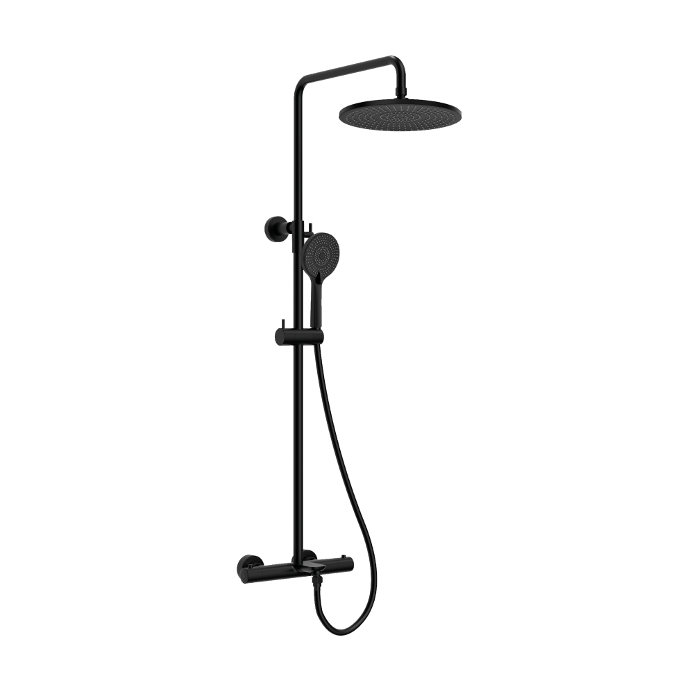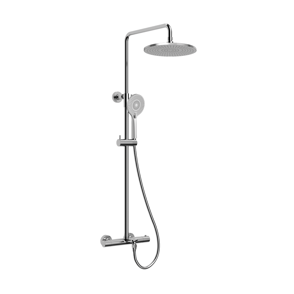 Colonne de douche GALA. En laiton, Mitigeur thermostatique avec inverseur intégré, Barre en inox réglable, Bec baignoire, Pommeau de douche en ABS Ø25 cm, Support et douchette 3 jets en ABS, Paire de rosaces, Flexible PVC 150 cm