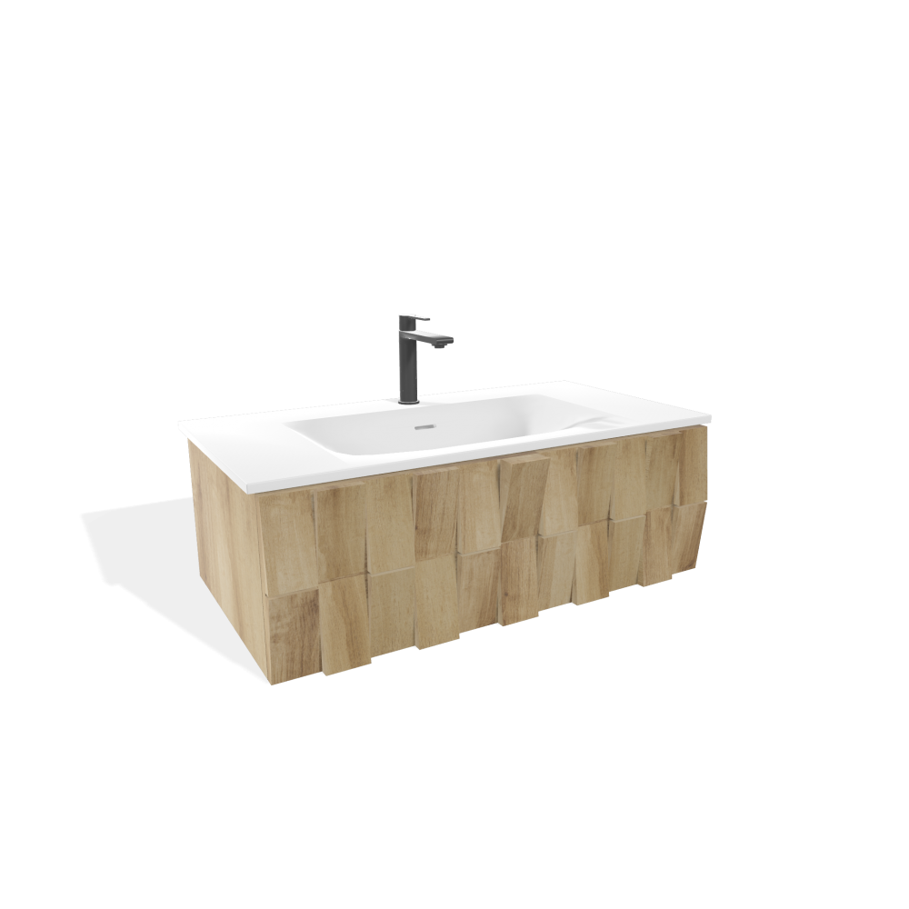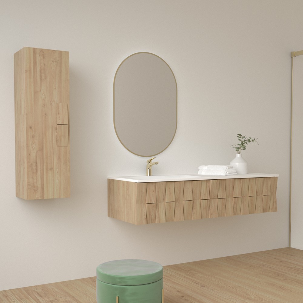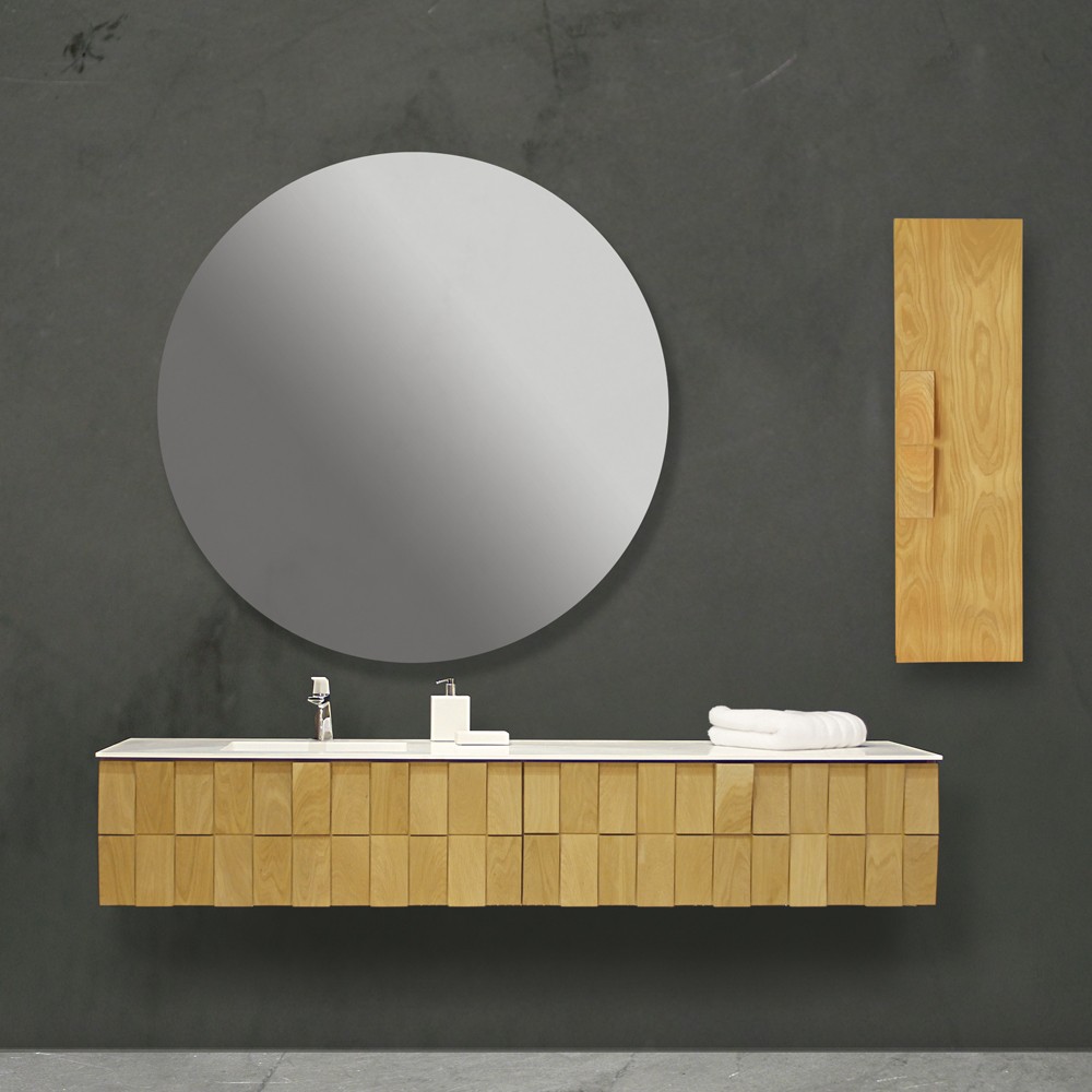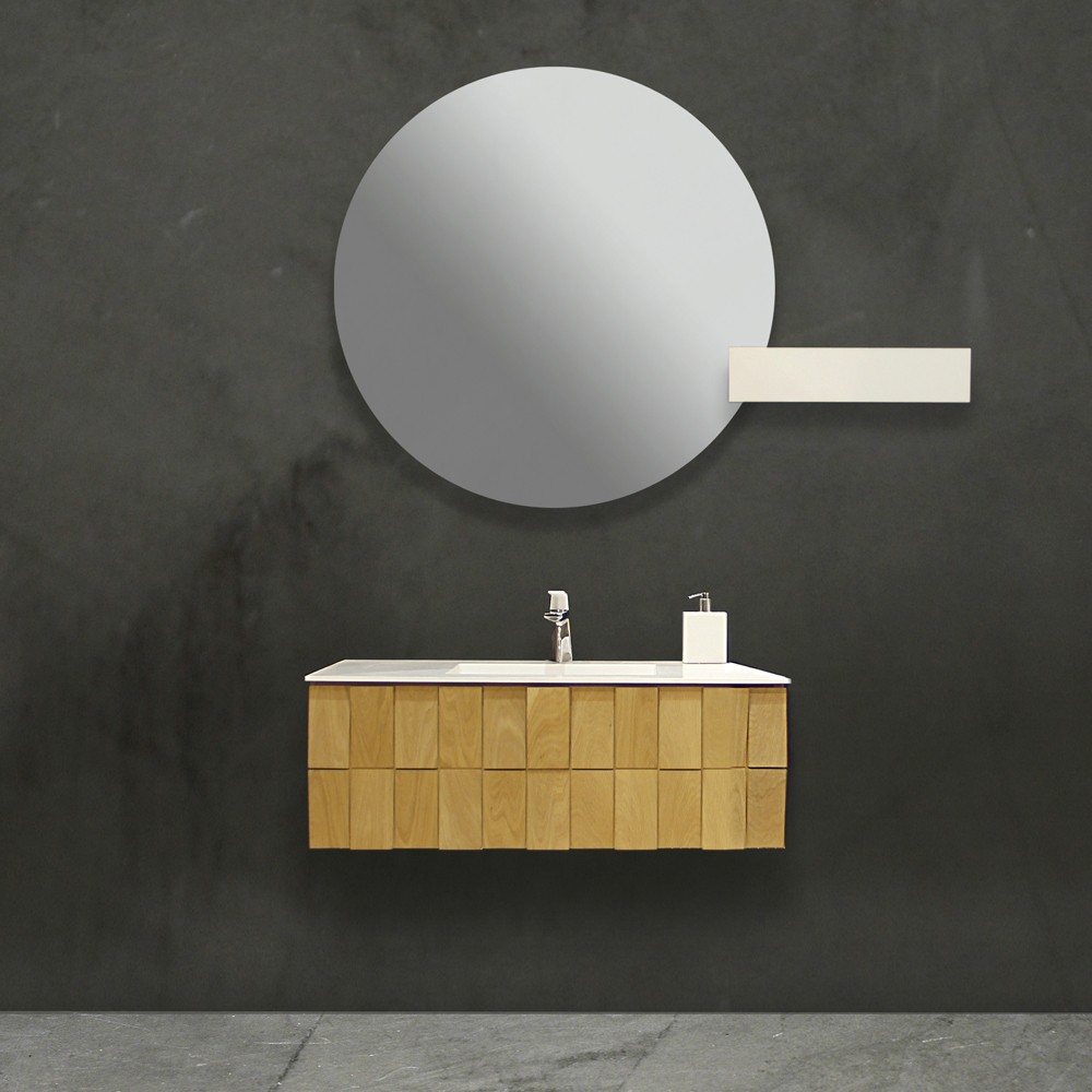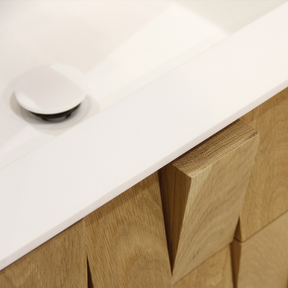 Un modèle signature de la créatrice inspirée par le caractère authentique du bois naturel. De multiples facettes en chêne massif rythment la façade du meuble Stratège telle une succession de notes harmoniques. Meuble 1 tiroir en simple vasque L900 – L1380 mm et en double vasque L1380 mm, Tiroir coulissant équipé de glissières, métalliques GRASS, avec fermeture progressive SOFT CLOSE, Ouverture totale, Prise de main centrale en chêne massif, Corps et façade en chêne massif ép. 21 mm, Livré sans vidage.