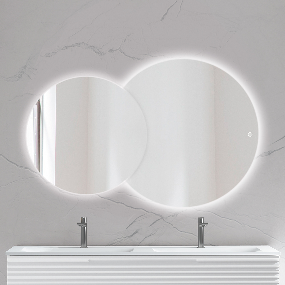 Miroir LED rétro-éclairant équipé d’un système antibuée, Deux ronds de diamètre Ø600 et Ø800 mm, Activation de l’éclairage et de l’antibuée par un interrupteur tactile, Réversible, Norme IP44, 14 Watts – 16-24 Watts antibuée – 1508 lm – 4000 K, Ruban de 60 LED/m