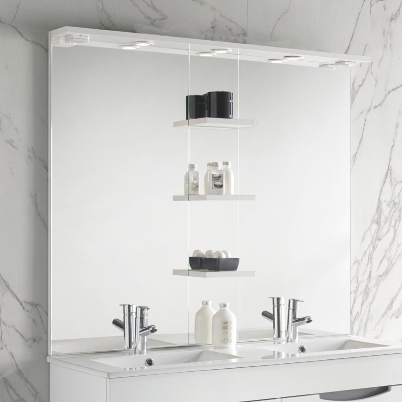 Gini carrelage, Disponible en 5 dimensions : L600 – 700 – 800 – 1000 – 1200 / Bandeau lumineux au dessus du miroir équipé d’un interrupteur, d’une prise et éclairages à LED – Norme IP44 classe 2 / 2 éclairages L600 et 800 – 3 éclairages L1000 et 1400 / Sans étagères (en 600et 700 mm), 2 étagères (en 800), 3 étagères (en 1200)