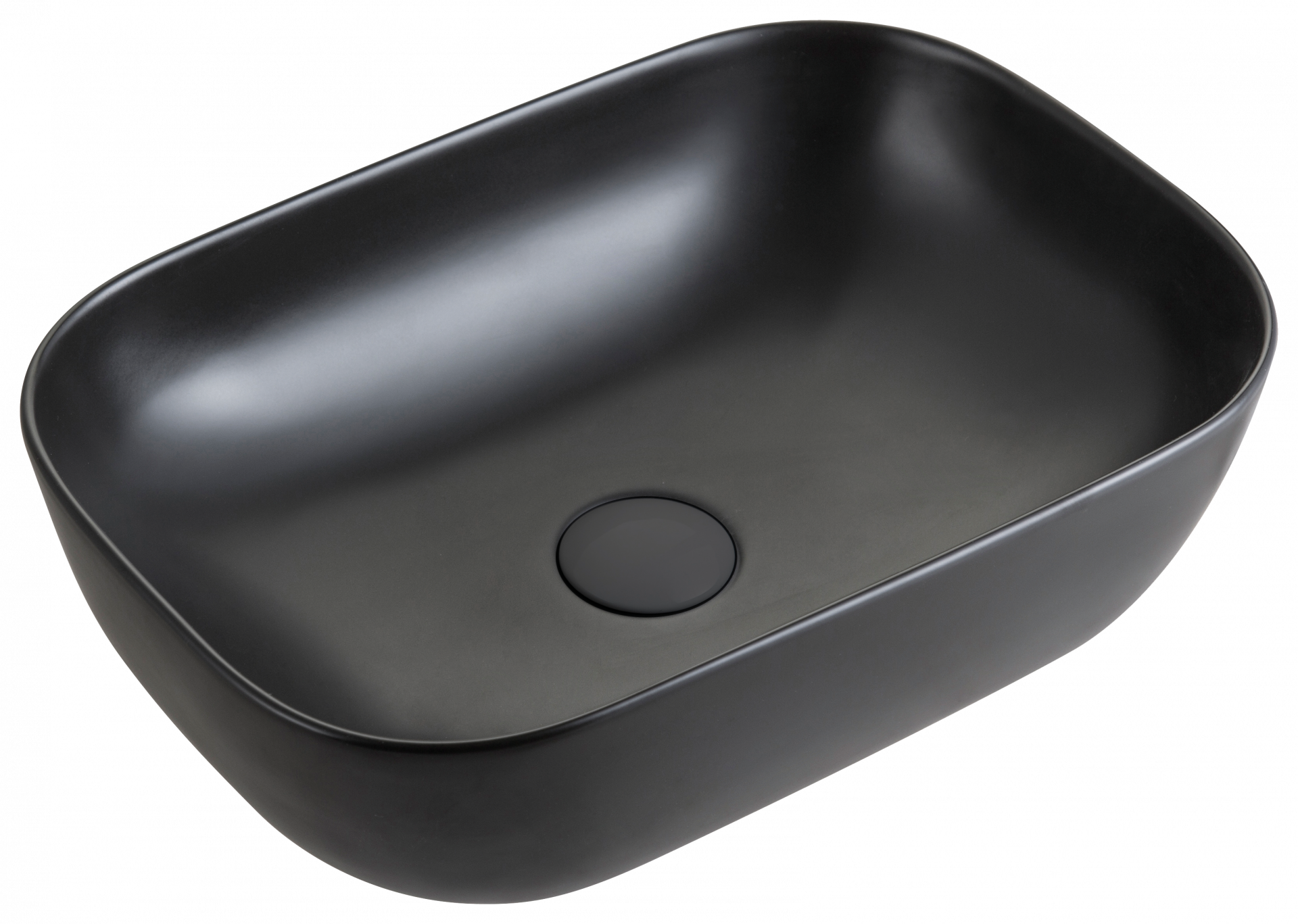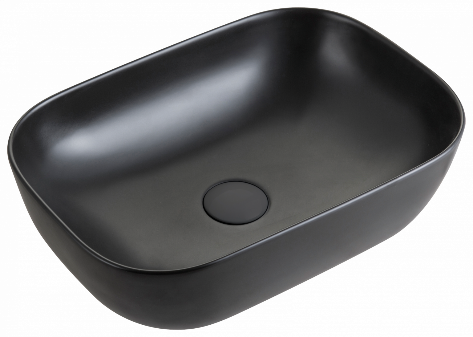 Vasque ovale céramique – Calypso chez Gini carrelage. Dimensions : L465 x P325 x H130 mm Sans trop-plein Finition noir mat – blanc brillant – blanc mat Livrée sans bonde